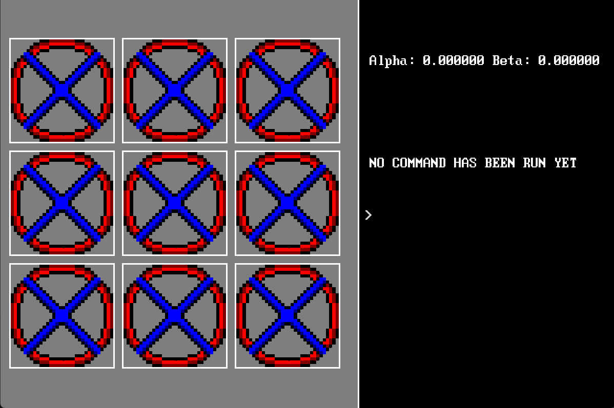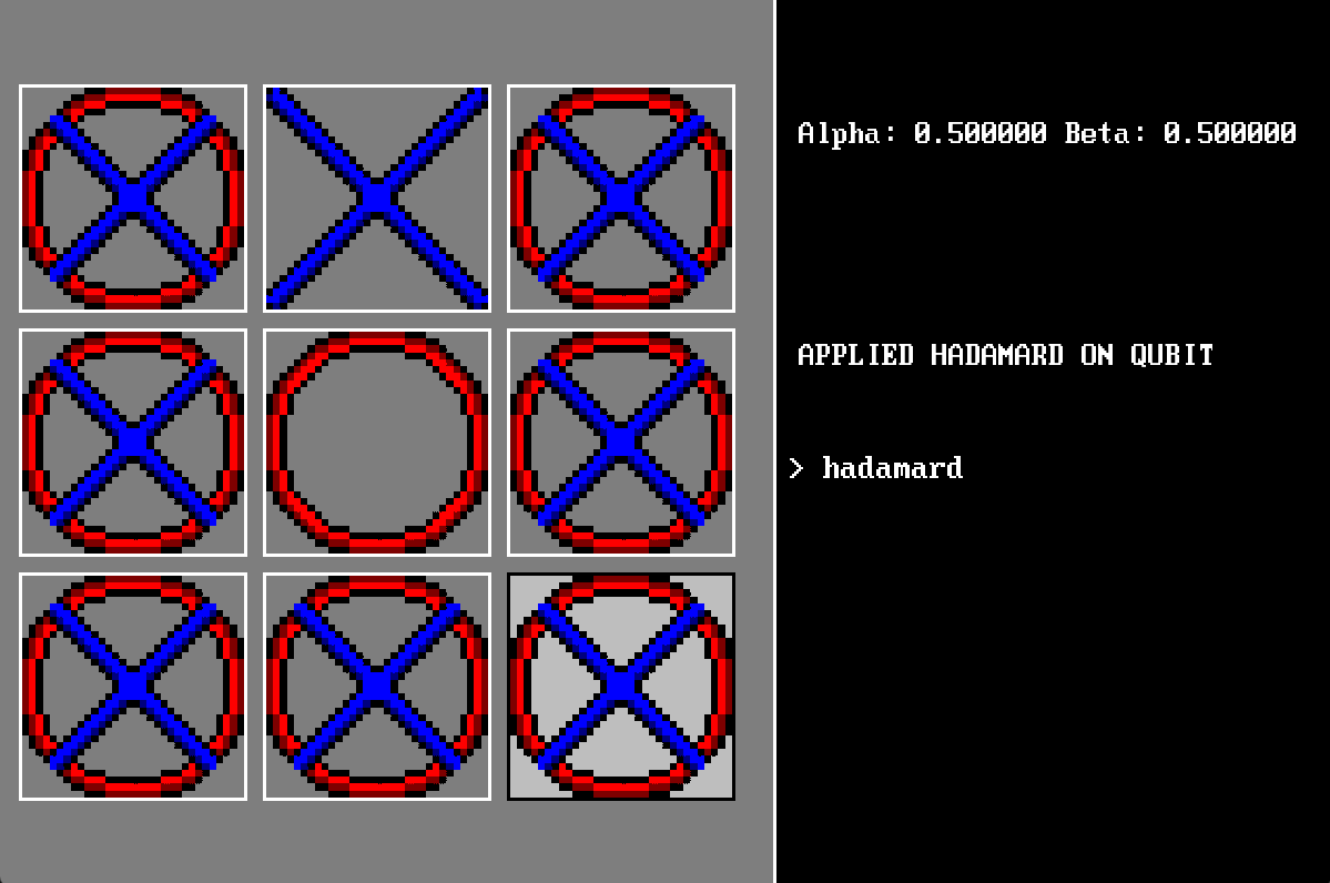 Each of the 9 cells holds a qubit in superposition. You manipulate qubits using quantum gates via a command line interface, then measure them to collapse their state to 0 or 1. The probabilities are real — amplitudes are stored as complex numbers, gates are matrix multiplications, and measurement samples from the actual probability distribution.